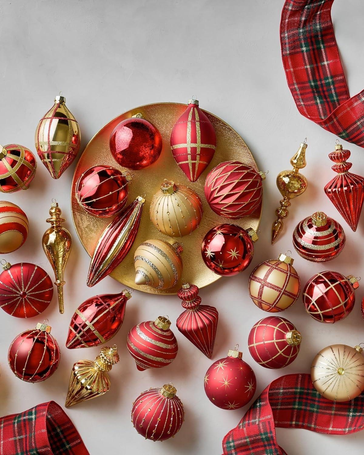 Elevate the look of your holiday greenery with touches of red and gold. These timeless ornaments add layers of texture