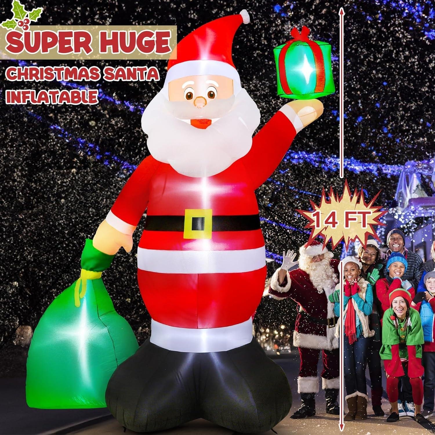 14FT Christmas Santa Inflatables, Giant Inflatable Santa with Gift Bag, Blow Up Christmas Santa Claus with 6pcs LED, Inflatable Santa Claus Outdoor Decorations for Party Holiday Lawn Yard Archway