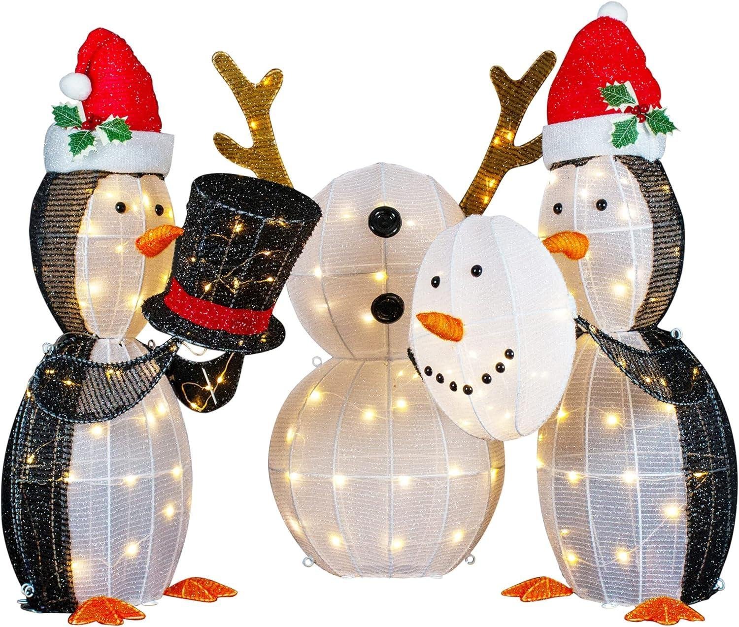 Set of 3 penguins playing with snowman yard decoration LED lighted with 140 warm white lights Cable ties and ground