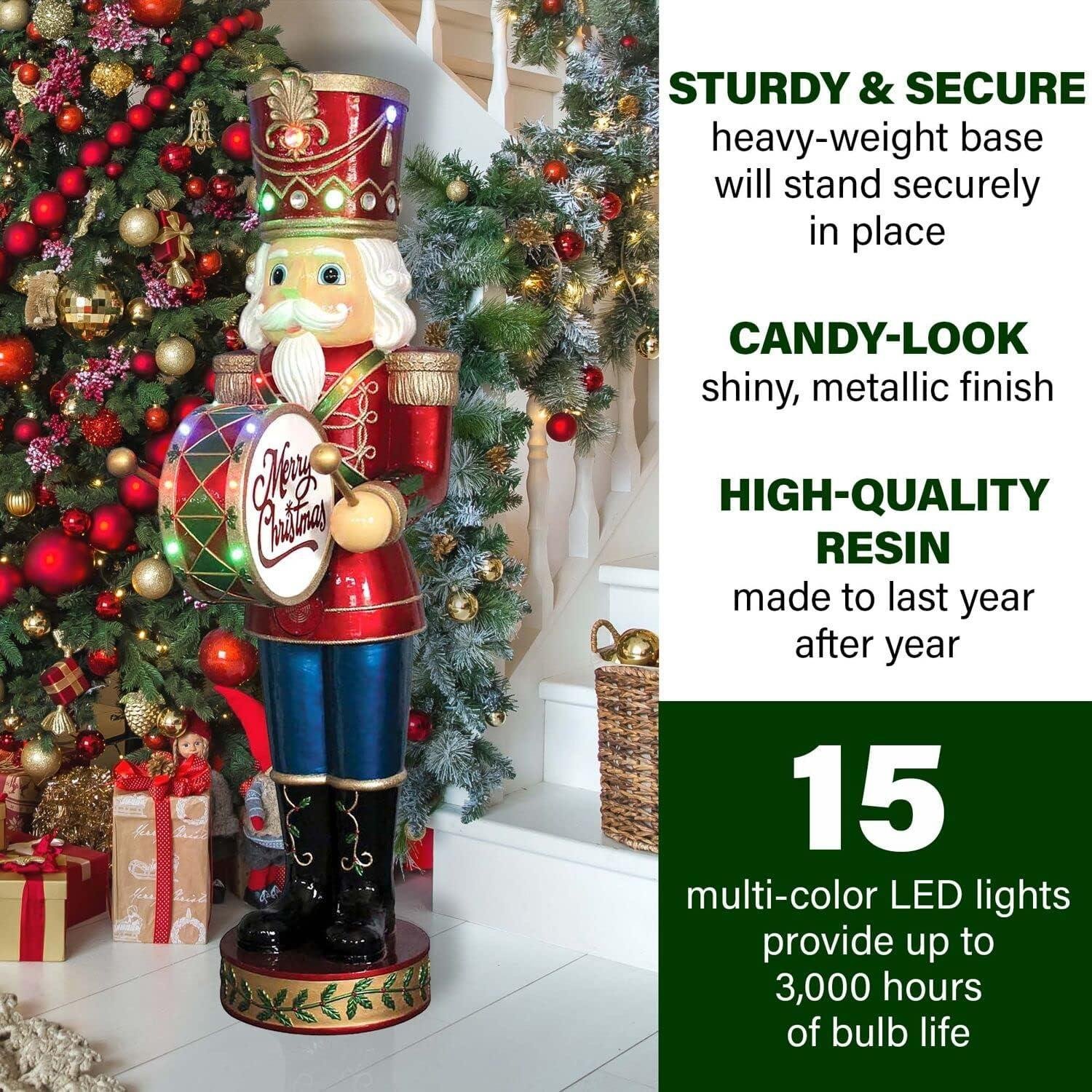Fraser Hill Farm FFRS060-NC5-RD Indoor/Outdoor 5-Ft. Nutcracker Playing Bass Drum with Moving Hands, Music, Timer, and 15 LED Lights Holiday Decoration, Color 1