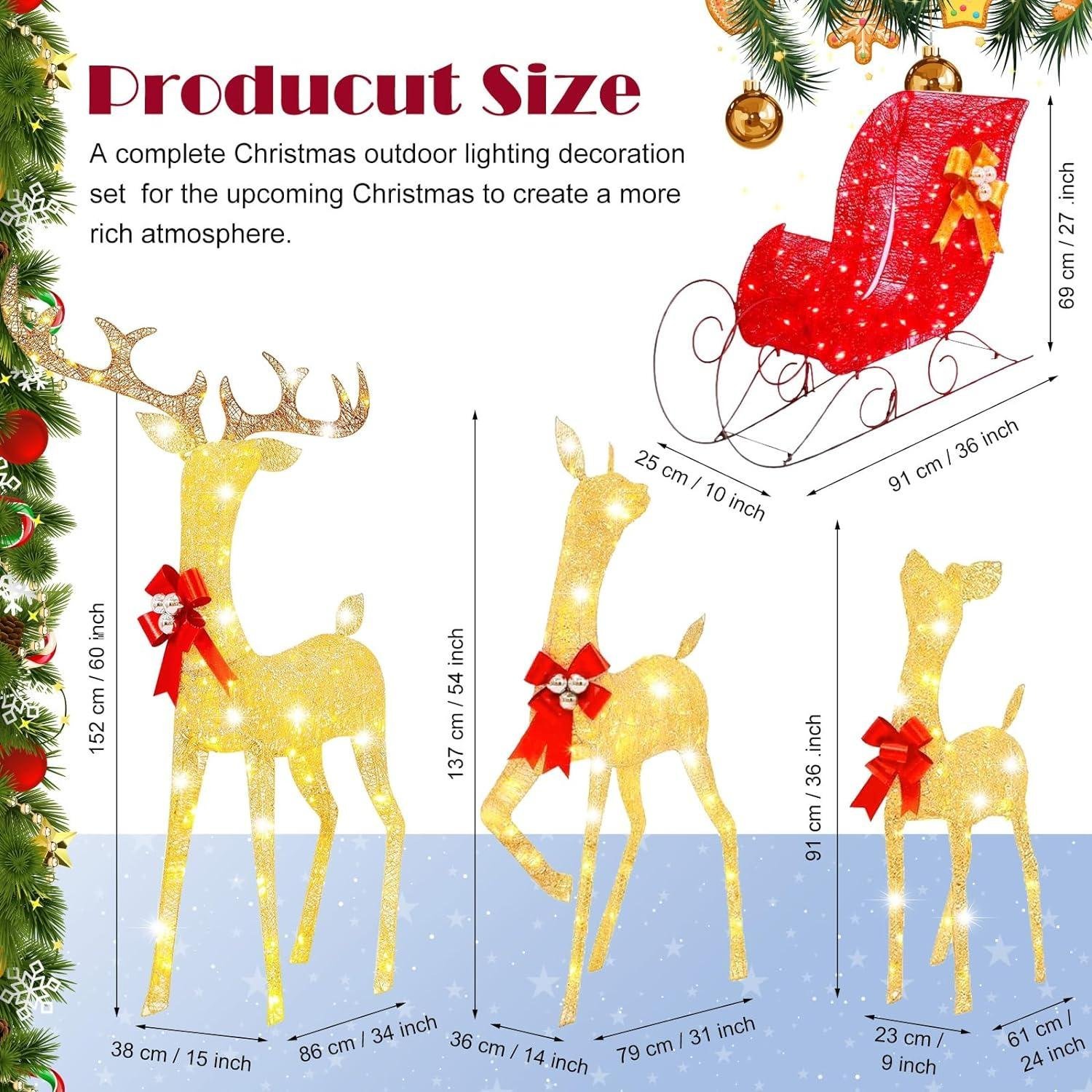 Complete Set: Products include three different sizes of large lighted Christmas reindeer and a lighted red sleigh. A Complete Christmas
