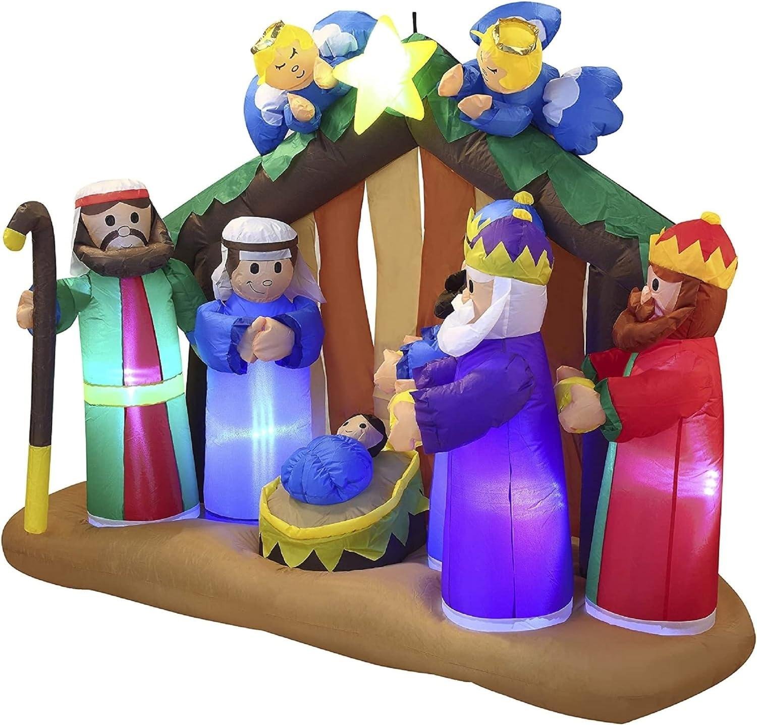 6ft Long Multicolored Nylon Nativity Scene with Angels Inflatable W/Internal Led Lights Indoor Outdoor Christmas