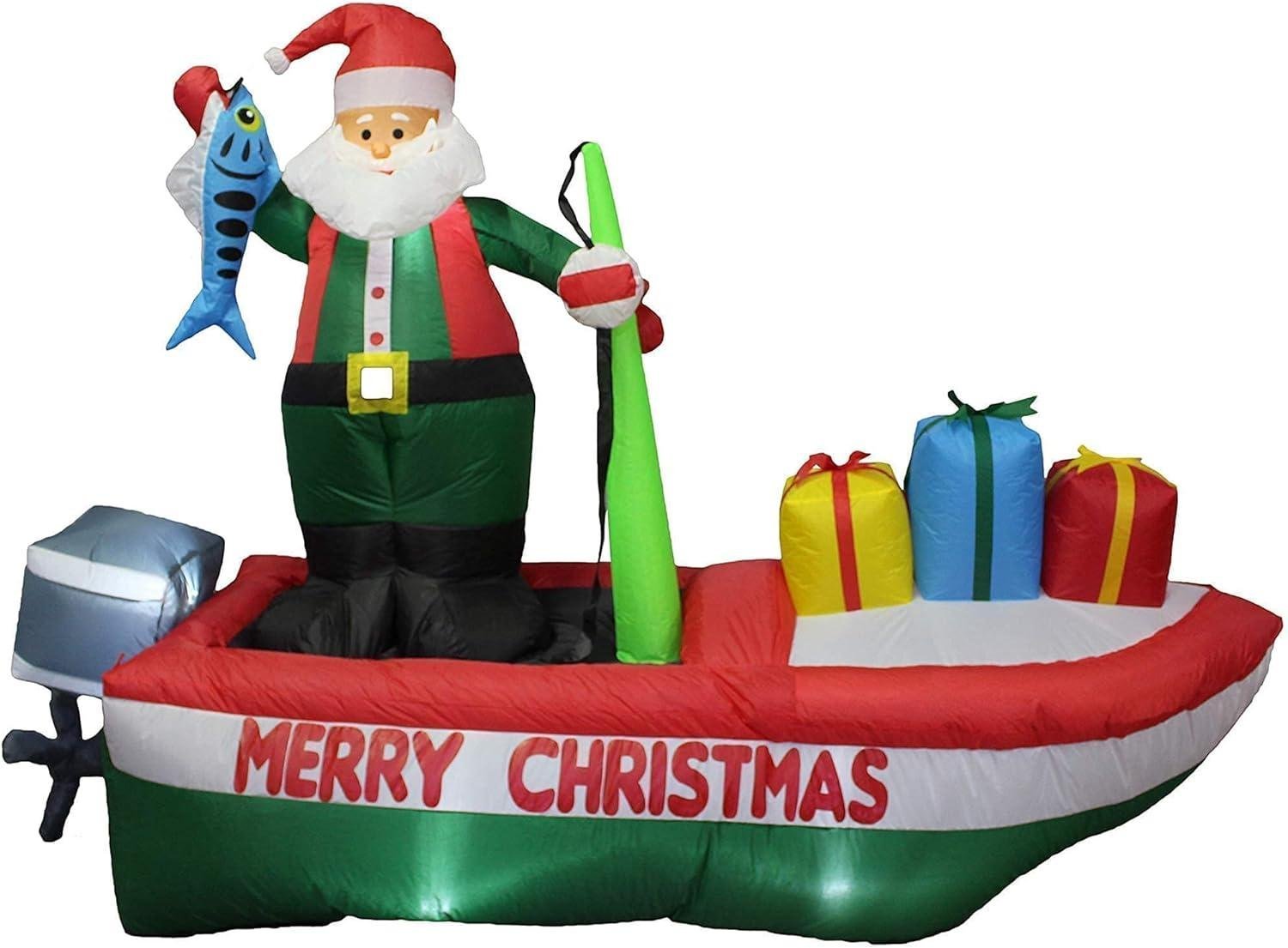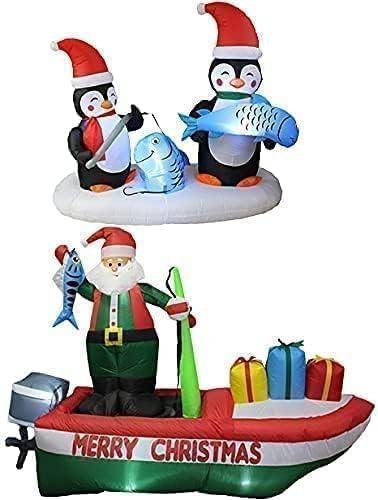 Two Christmas Party Decorations Bundle, Includes 8 Foot Long Inflatable Santa Claus on a Fishing Boat, and 6 Foot Long Lighted Christmas Inflatable Two Penguins Happy Fishing Blowup with Lights