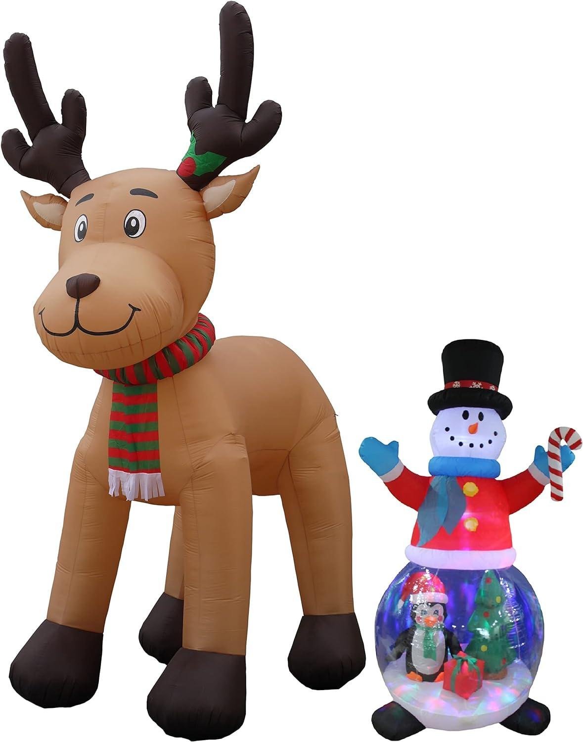 Two Christmas Party Decorations Bundle, Includes 15 Foot Christmas Inflatable Reindeer Decoration, and 8 Foot Tall Christmas Inflatable Snowman Globe with Penguin and Gift Box Christmas Tree Blowup
