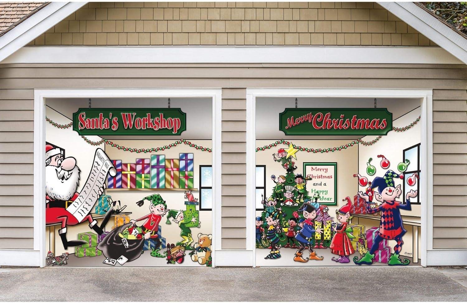 - Red And Green Santa’s Workshop Split Car Garage Door Banner