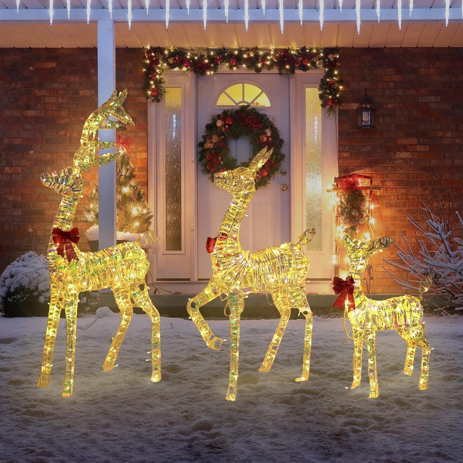 - Enhance your outdoor Christmas decor with this stunning 3-piece reindeer family set, featuring large deer figures that will make a statement in your yard.
