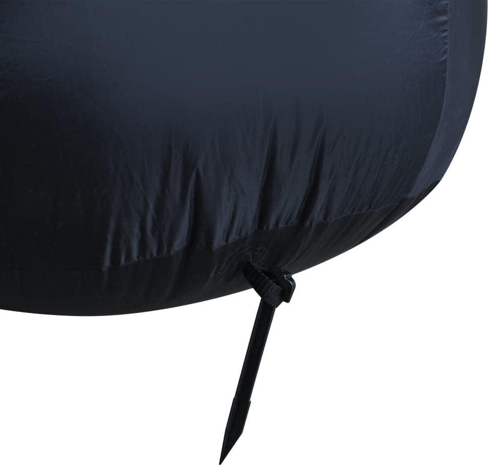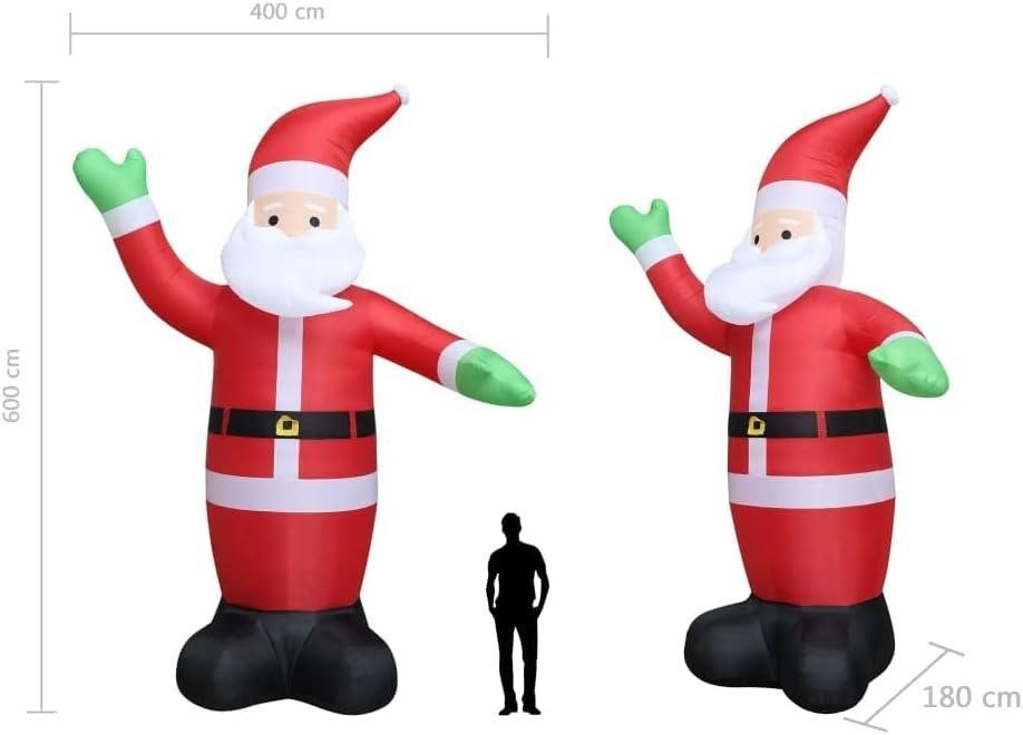 - Material: 100% Polyester fabric + plastic.Height: 236.2″.Input voltage: 100-240 V, 50 Hz.Output: 12 V.Power: 45 W.IP rating: IP44.With 6 energy saving LEDs.Includes 2 blowers integrated in the inflatable santa to keep air in the product.Accessories include: .1 x Adaptor.4 x Ground ropes.8 x Ground stakes.