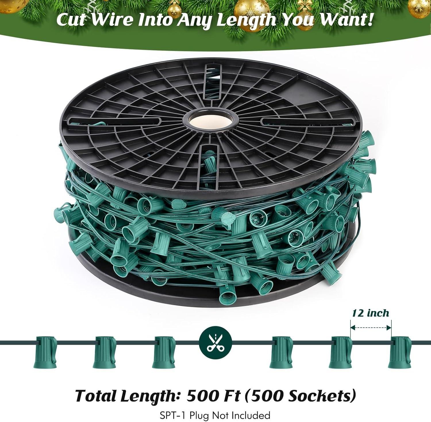 Brightever Commercial 500 FT C9 Christmas LED String Lights, E17 Light Sockets Set Spool, C9 Sockets Patio String Lights C9 Strands – 12 Spacing Intermediate Base Green Wire String Lights