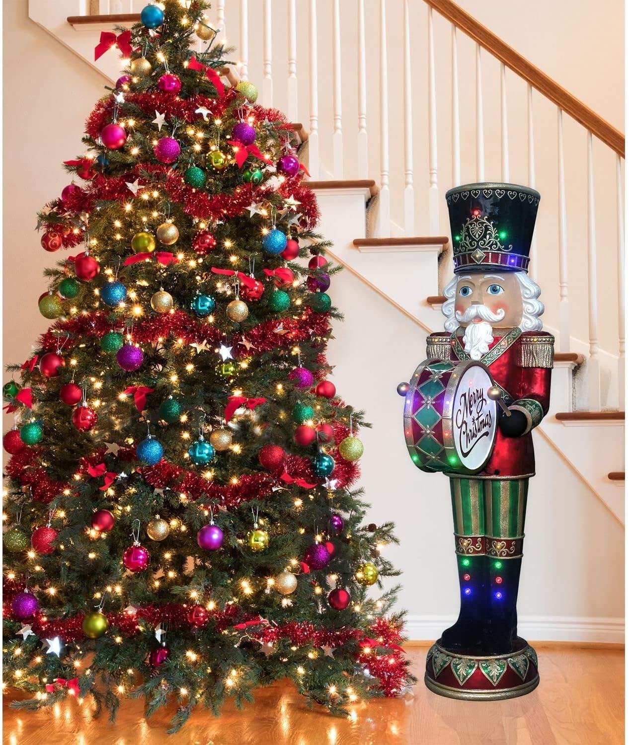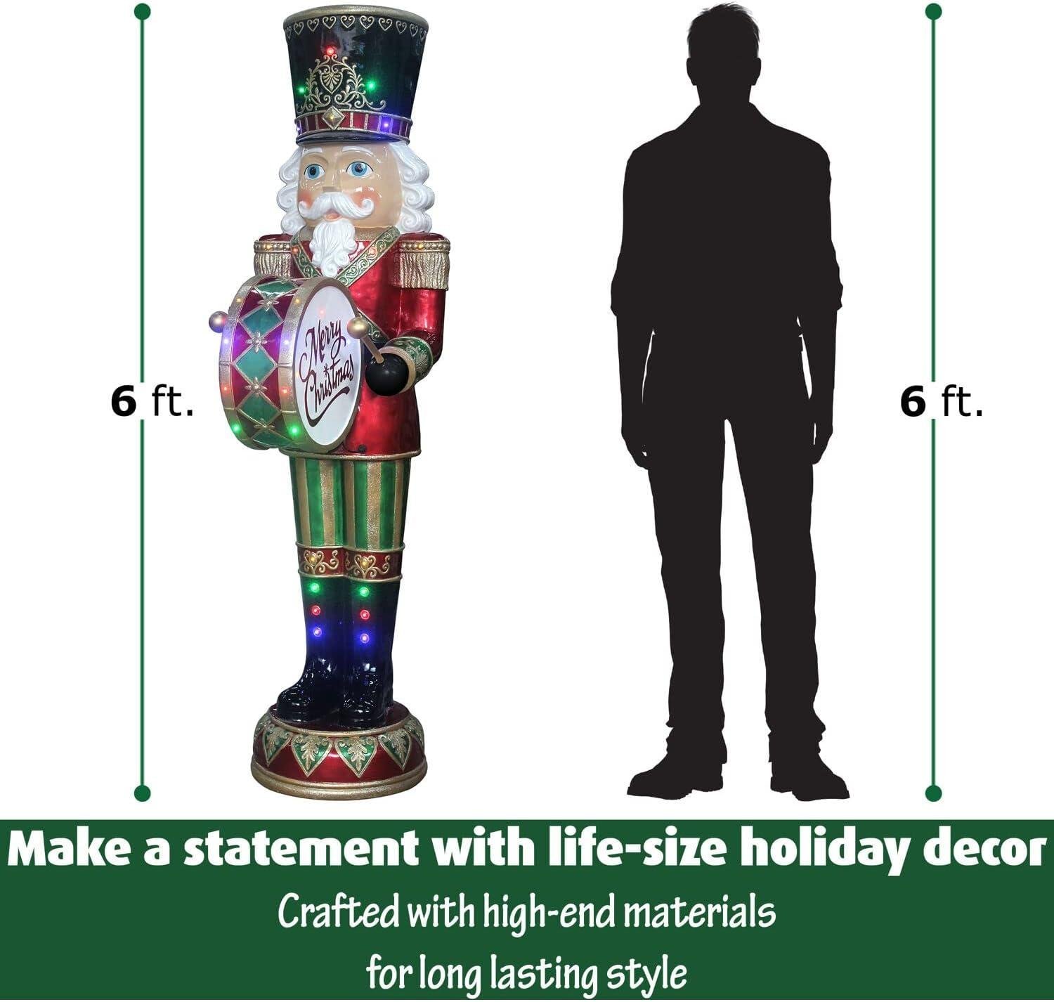 Fraser Hill Farm FFRS072-NC5-RD Indoor/Outdoor 6-Ft. Nutcracker Playing Bass Drum with Moving Hands, Music, Timer, and 32 LED Lights Holiday Decoration, Color 4
