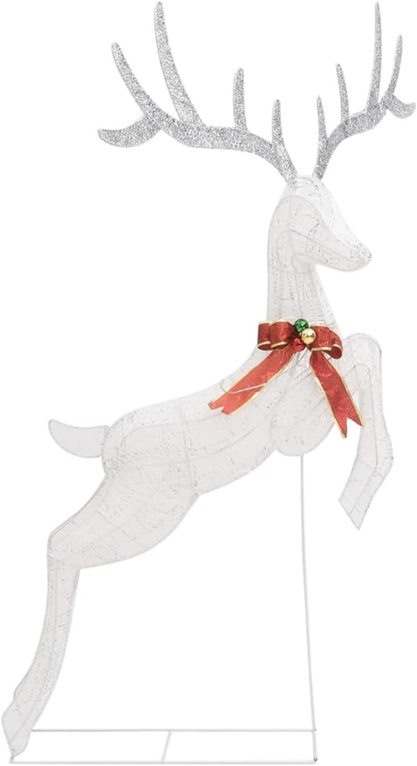 Decorate your house with this Christmas flying reindeer. It comes with a beautiful bow on its neck to add a special touch. Made of b fabric, this Xmas decoration is durable. The glowing reindeer features 120 LED lights, which are energy-efficient and long-lasting. Thanks to the mesh design, it produces a magnificent effect while lighting. Designed with 8 different lighting effects: a combination of all the effects, slow-glow, twinkle/flash, in wave, chasing/running water, sequential, steady on and slow fade, it beautifully lights up and creates a magical holiday atmosphere. Note: The included USB is not waterproof so this part has to avoid the water, but thanks to the 16.4′ cable the reindeer can be used outdoors as the cable and product are waterproof. The product has a USB connector, but the certified 5V USB power source is not included.Color: White and silverLight color: Cold whiteMaterial: FabricDimensions: 41.3″ x 27.6″ x 57.1″ (L x W x H)Cable length: 16.4’Voltage: DC 5 VPower: 5 WWith 120 energy-saving LEDsA USB is includedStrong fabricSuitable for indoors and outdoorsCalifornia Proposition 65