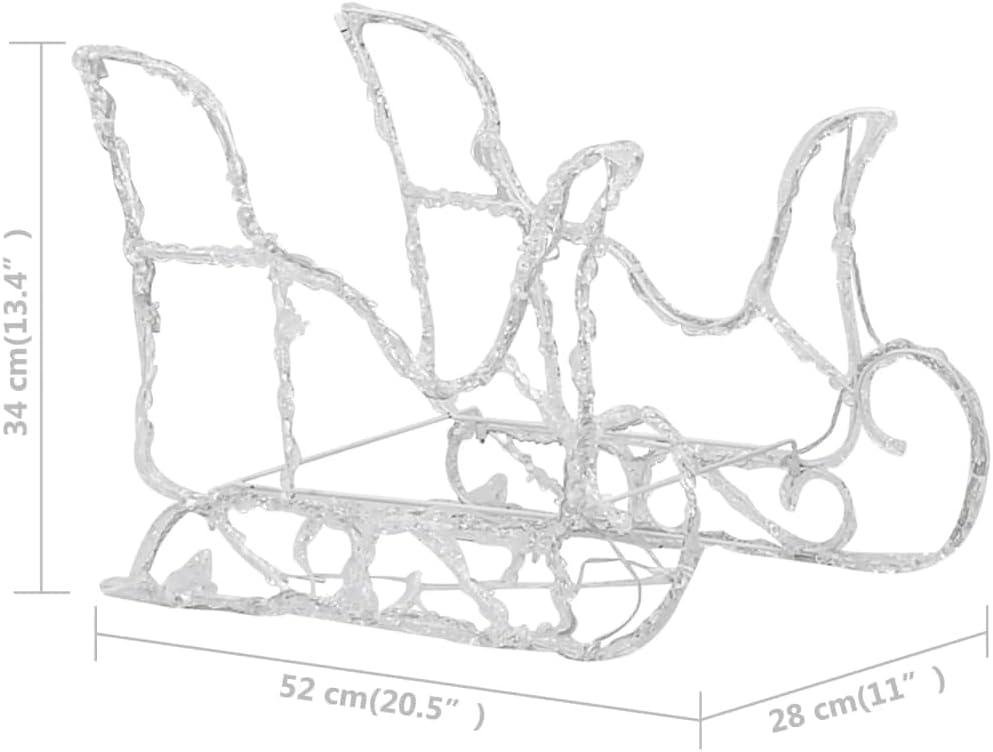 - Light color: Warm white.Material: Acrylic, steel, PVC.Whole length: 51.2″.Reindeer dimensions: 16.9″ x 4.3″ x 21.7″ (L x W x H).Sleigh dimensions: 20.5″ x 11″ x 13.4″ (L x W x H).Cable length: 16.4′.Number of LEDs: 160.Voltage: DC 5 V.Power: 5 W.With energy-saving and durable LEDs.Suitable for indoor and outdoor use.Assembly required: Yes.