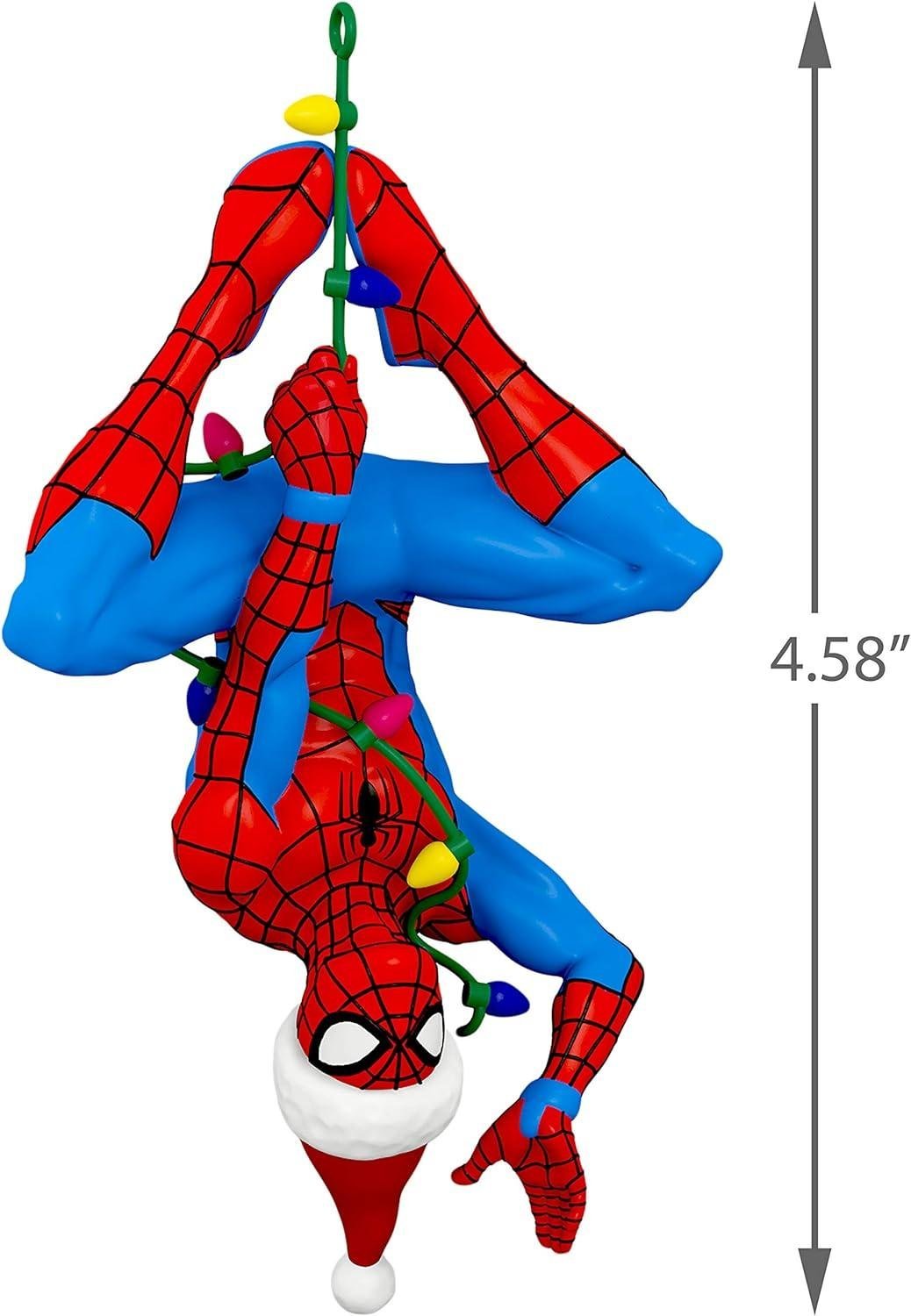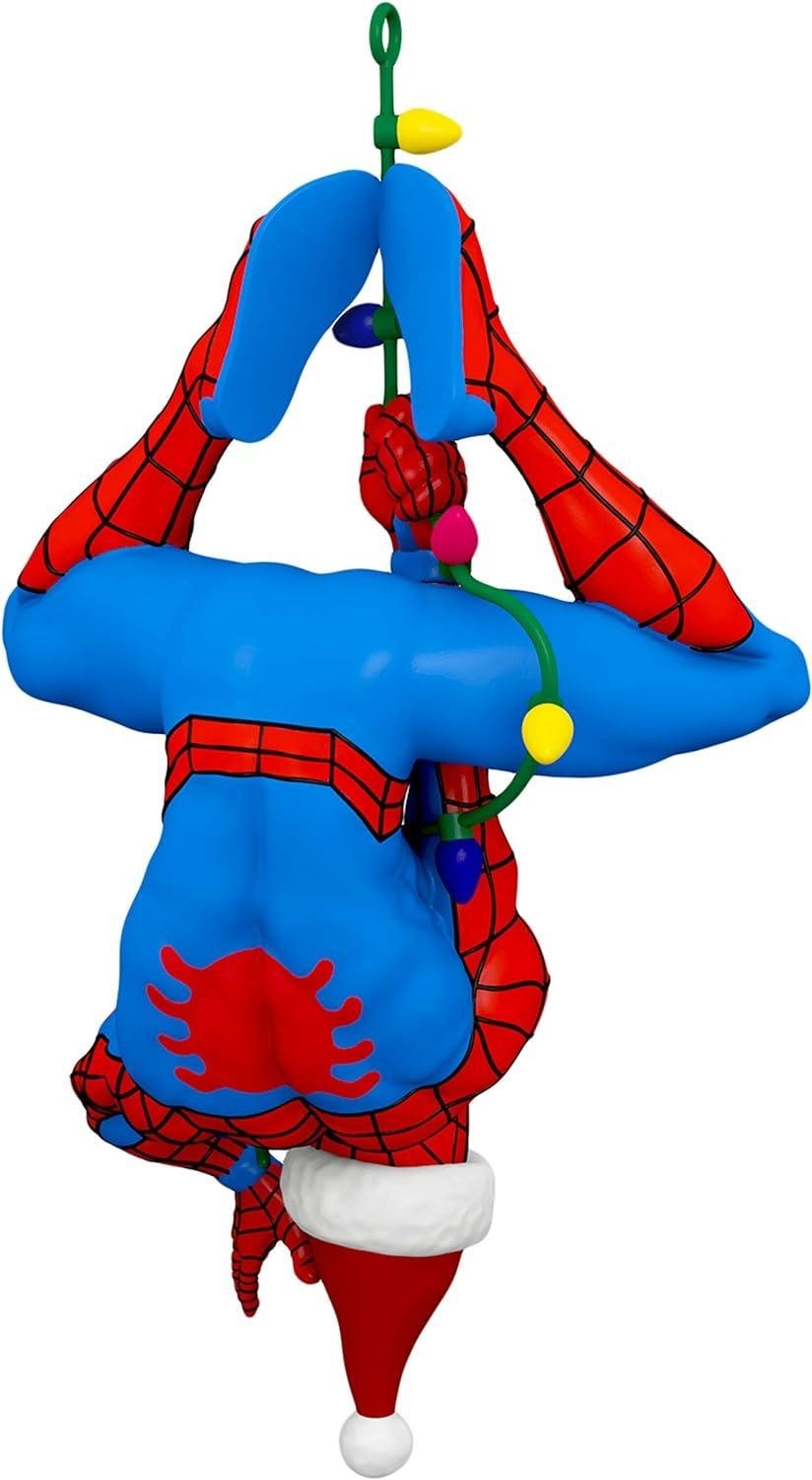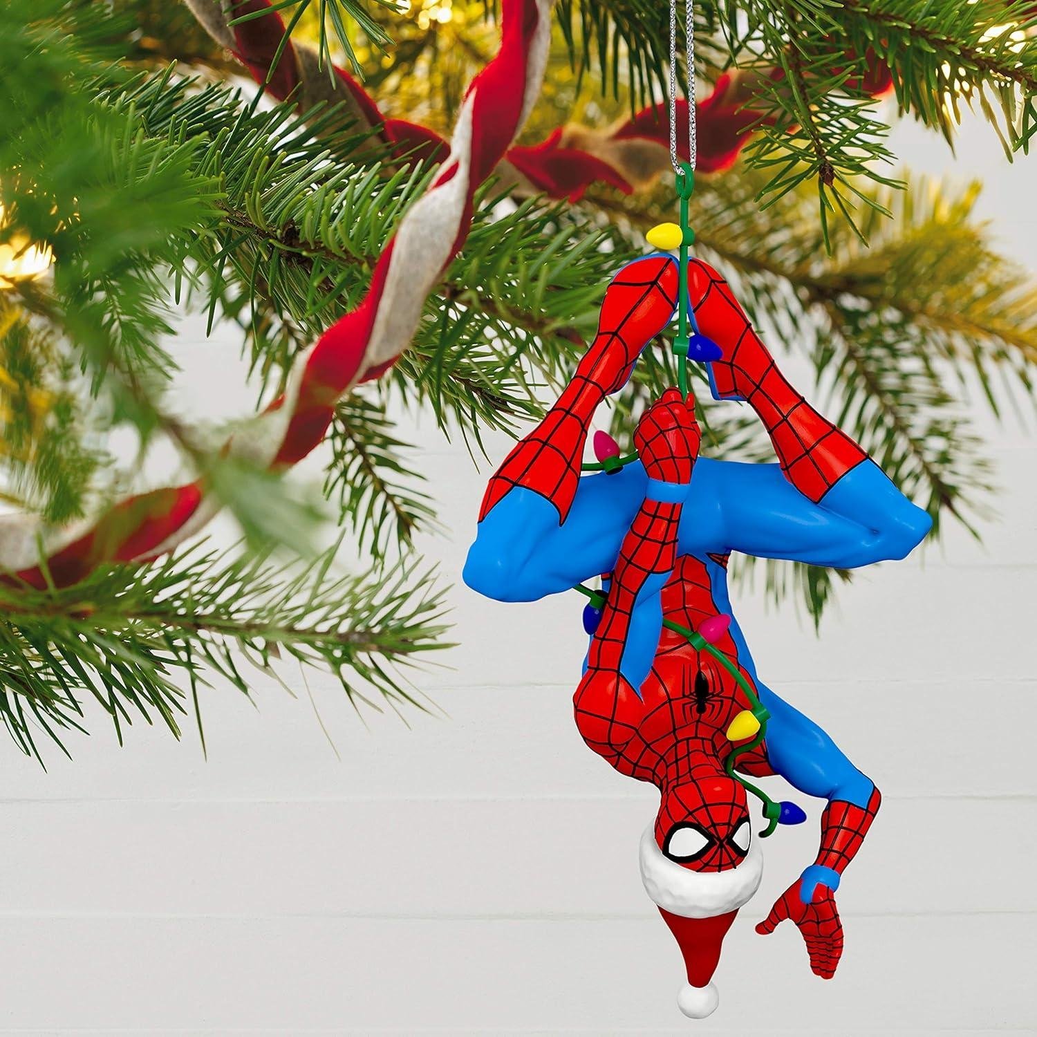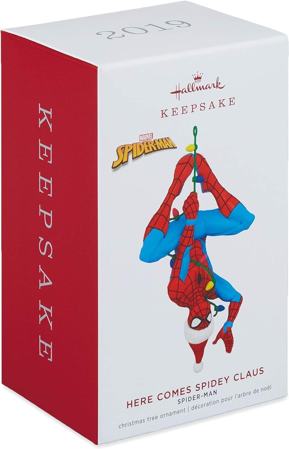 - Make the holidays more heroic with this Here Comes Spidey Claus Christmas ornament that features Spider-Man wearing a Santa hat while hanging from a colorful light string.