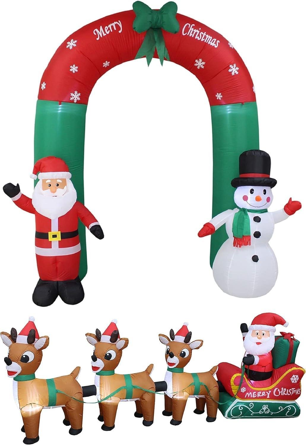 Two Christmas Party Decorations Bundle, Includes 8 Foot Long Christmas Inflatable Santa on Sleigh with 3 Reindeer and Christmas Tree, and 5 Foot Tall Huge Christmas Inflatable Snowmen Snowman Campfire
