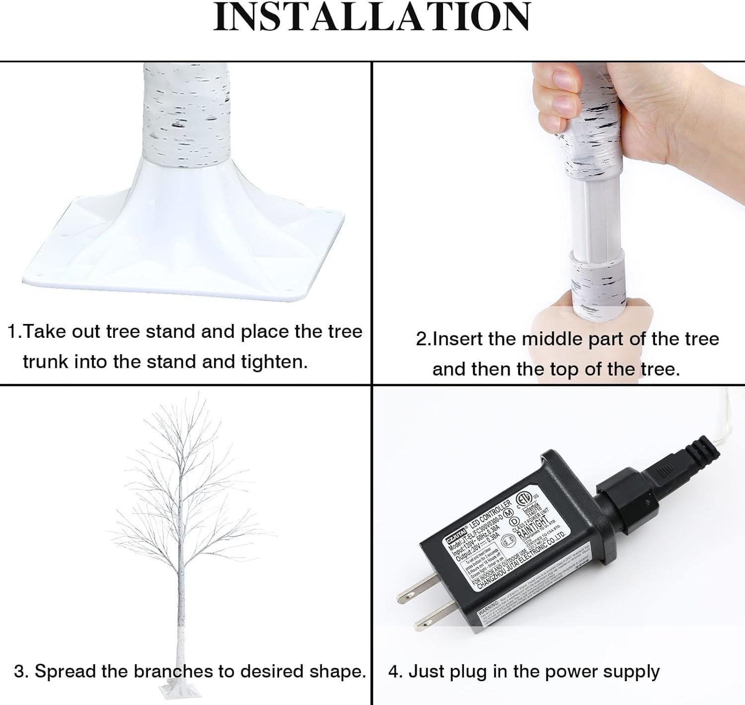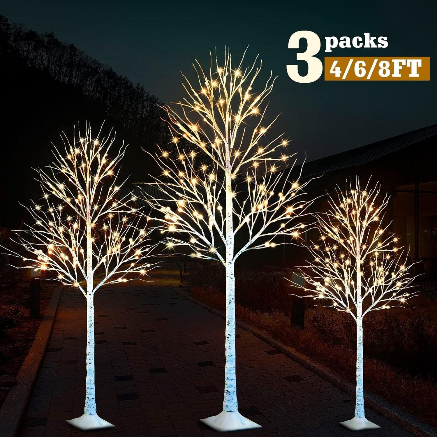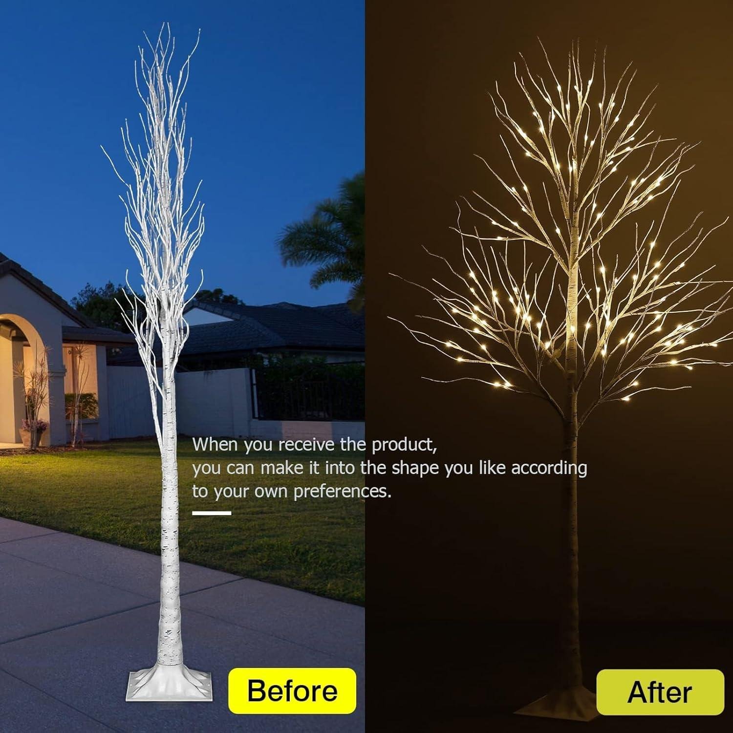 - ?Birch Tree with Lights: Available in 3 lengths – 4/6/8 FT, featuring 48 LEDs (4FT), 88 LEDs (6FT), and 160 LEDs (8FT), with easy on/off switch, warm and inviting illumination. These lights mimic the charm of birch trees with textured branches and lifelike birch bark, bringing joy and delight to your neighbors, friends, and family.