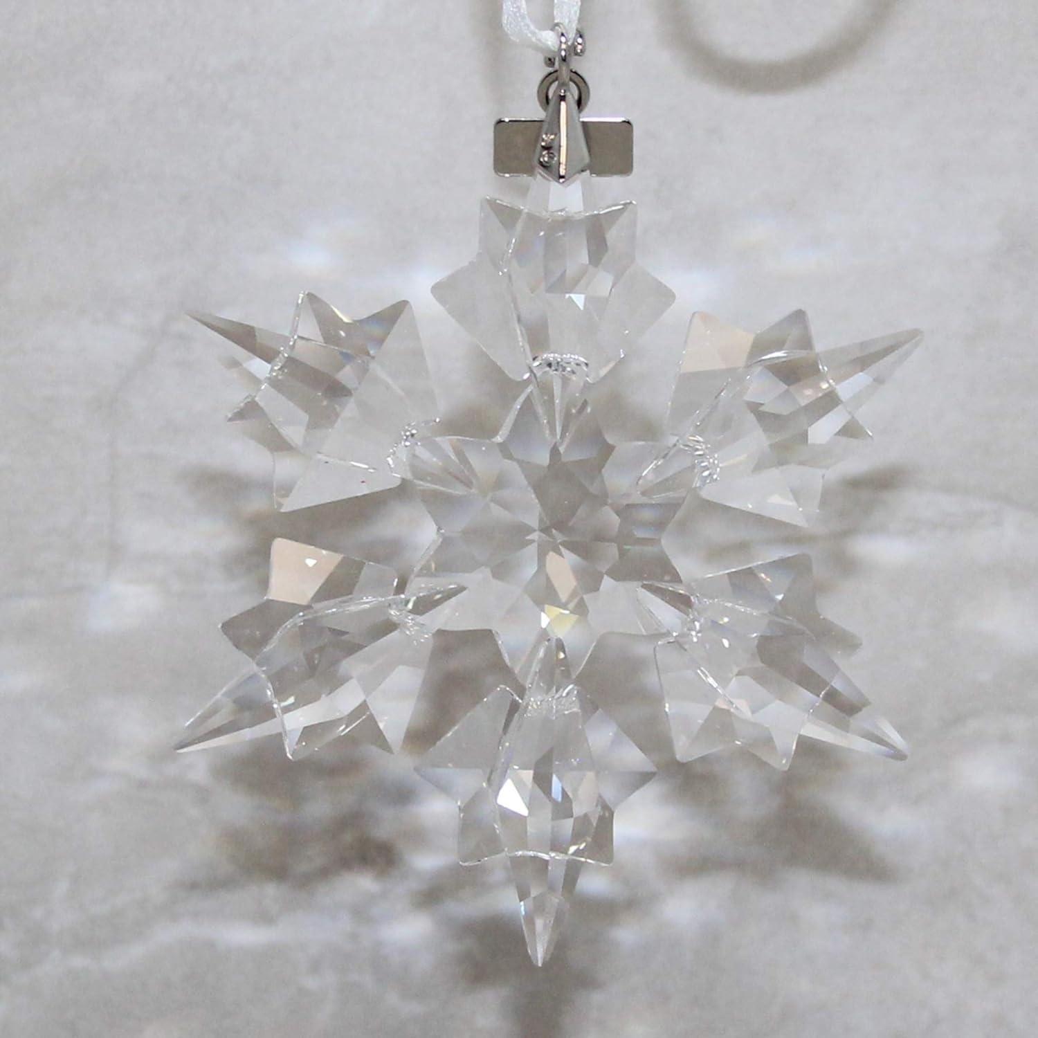 - Elegant clear crystal snowflake from Swarovski comes with a silver-tone metal tag and white satin ribbon