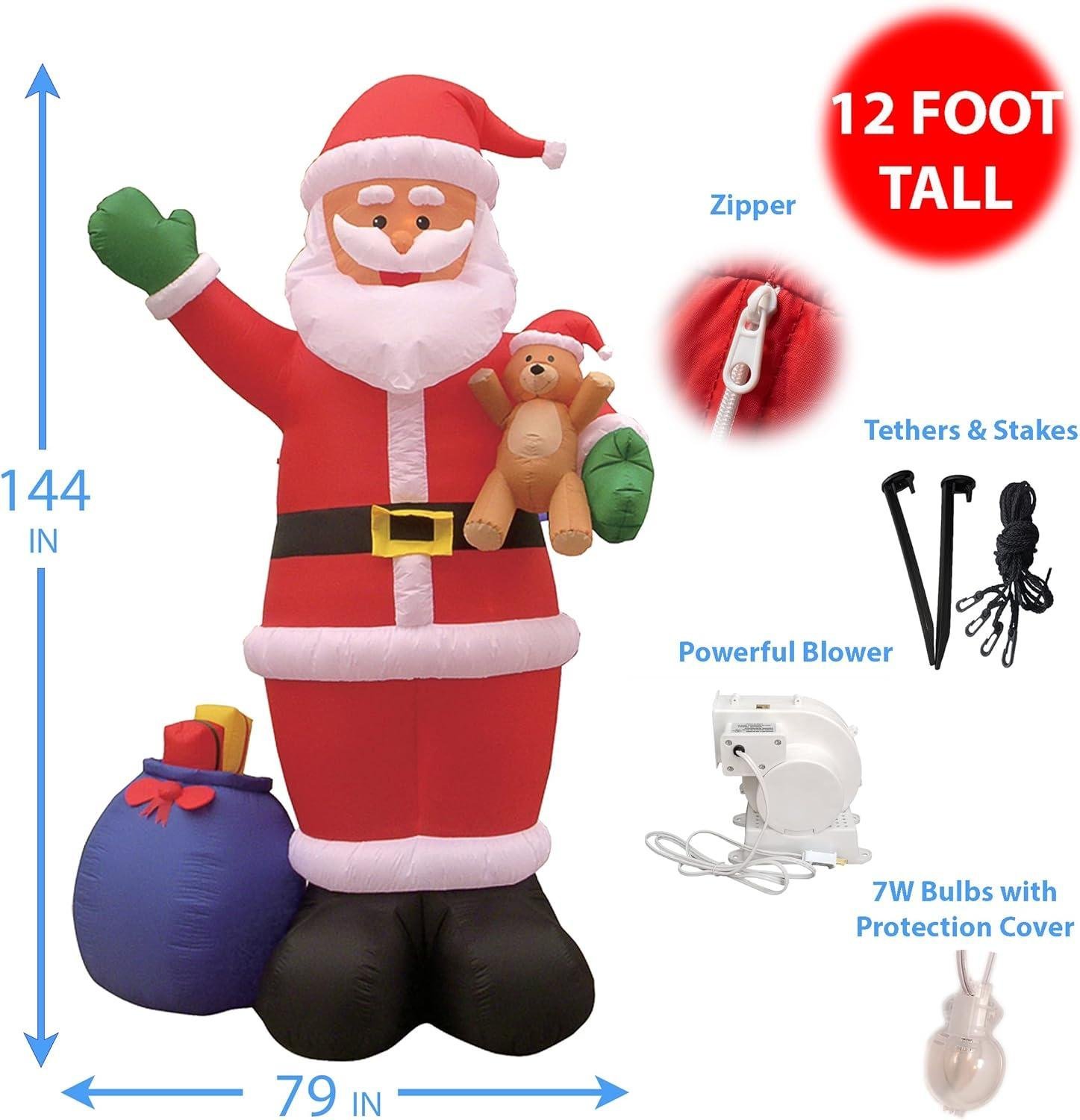 - 12 Foot Tall Huge Christmas Inflatable Santa Claus with Gift Bag and Bear Inflated size measures (L x W x H): 79 x 43 x 144 inches