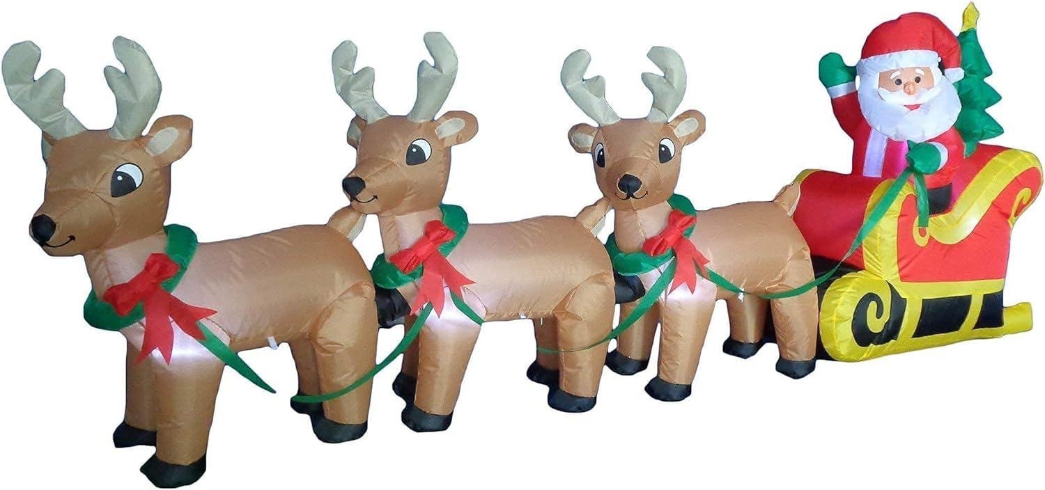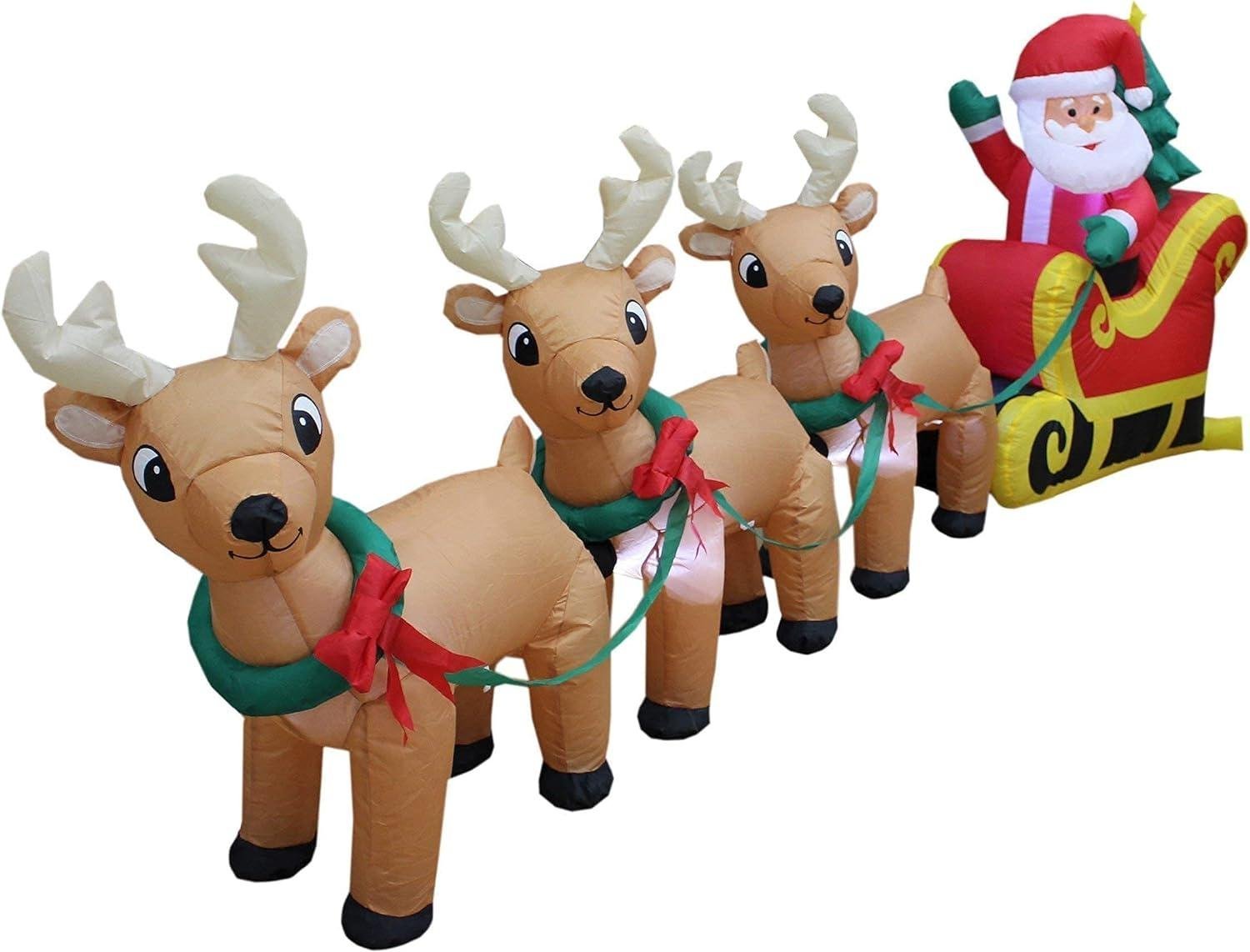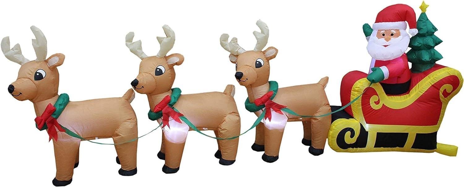 - 8 Foot Long Christmas Inflatable Santa Claus on Sleigh with 3 Reindeer and Christmas Tree Inflated size measures (L x W x H): 96 x 14 x 36 inches