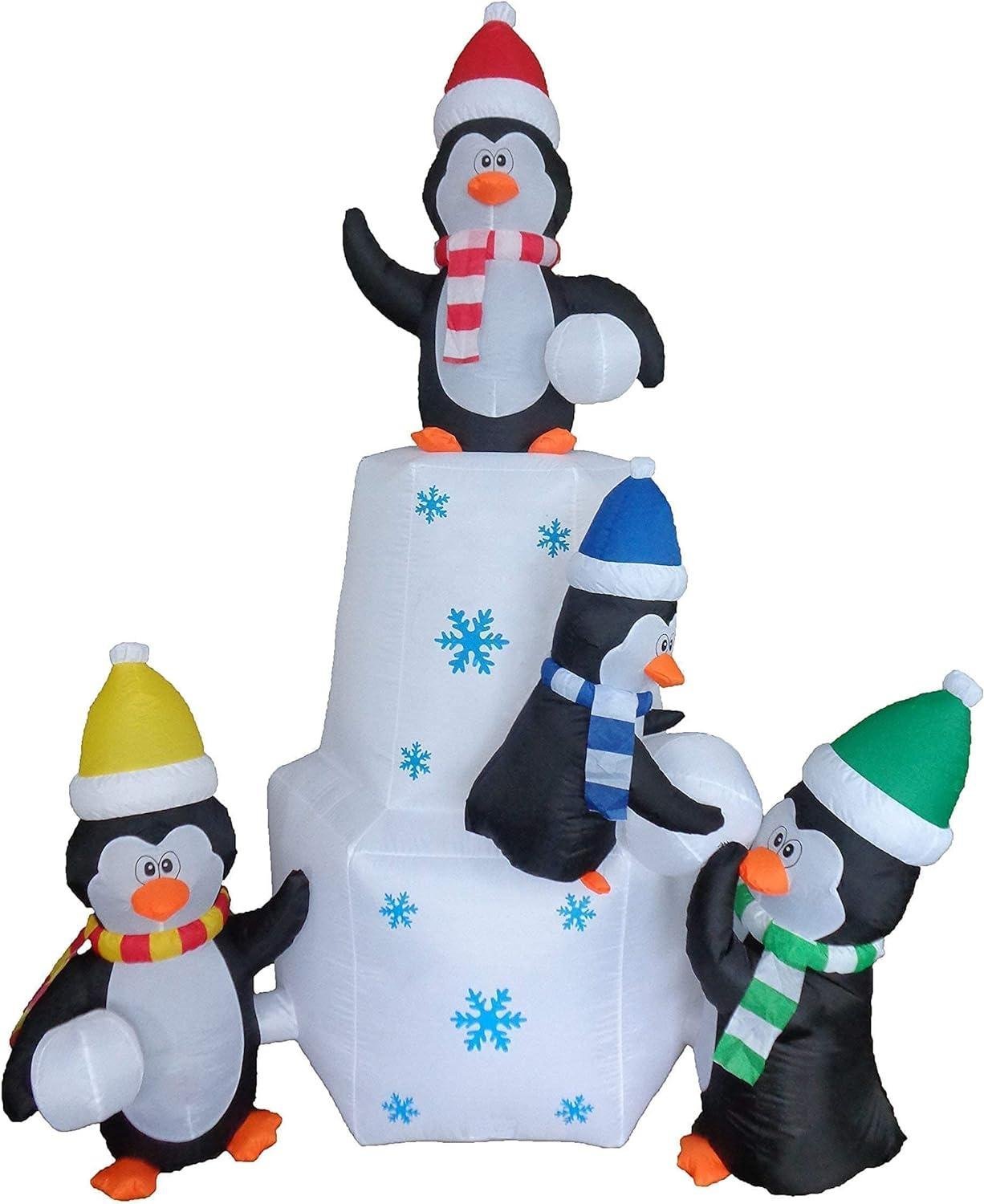 - 8 Foot Tall Inflatable Penguins Family Playing Snowballs in the Snow Inflated size measures (L x W x H): 48 x 72 x 96 inches
